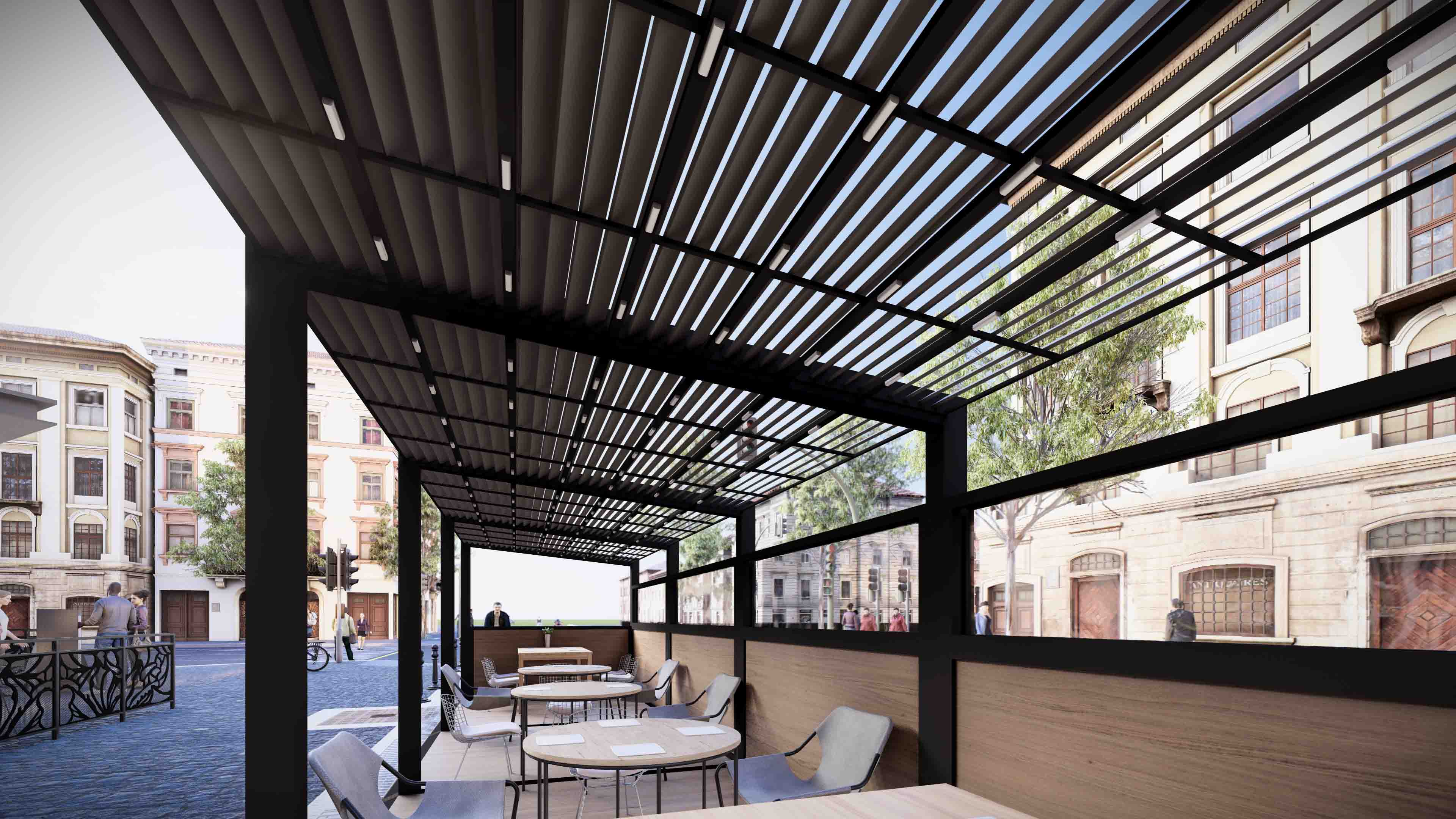 An architectural-grade pergola system with motorized panels, fixed aluminum frame, and optional retractable shading.